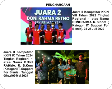 Juara II Kompetitor KKIN IX Tahun 2024 Tingkat Regioanl 1 atas Nama DONI RAHMA. R. S.Kom ( Kategori IT. Support For Bisnis). Tanggal 05 s.d 09 Mei 2024